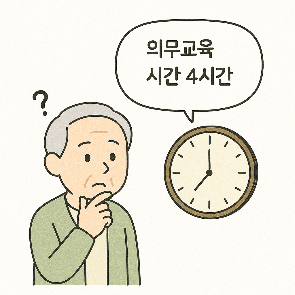 - 노인인권 의무교육은 장기요양기관·노인복지시설 종사자라면 연 1회 4시간 이상 필수입니다.