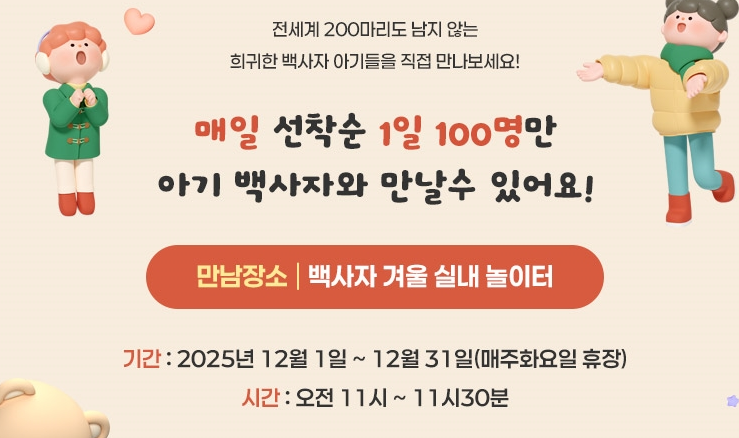 네이처파크 아기백사자 산책 체험은 대구 겨울 가족 나들이에 제격! 아이와 함께하는 특별한 실내 체험으로, 12월 한정 운영·예약방법·가격·주차·사진 팁까지 모두 정리했습니다.