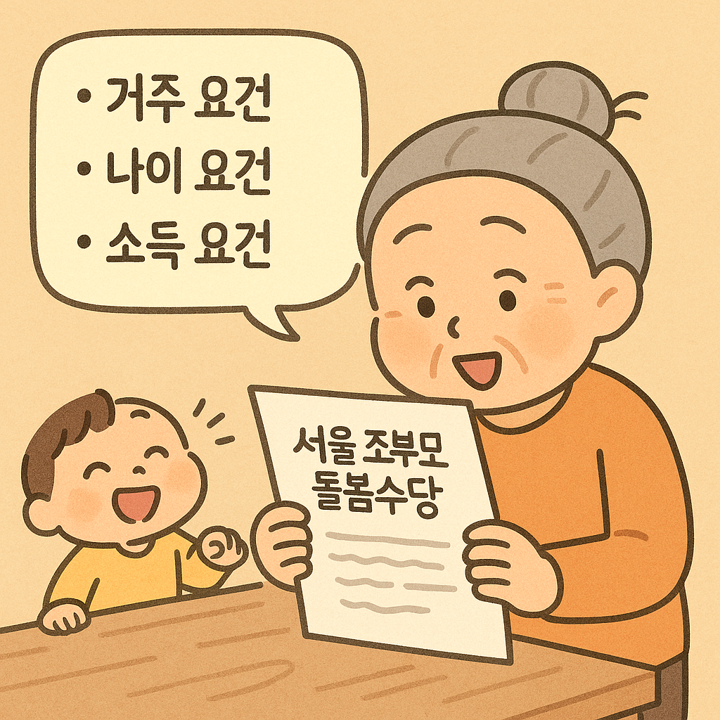 서울 조부모 돌봄수당 자격조건은 사람 기준으로 복잡하게 나눌 수도 있지만, 실질적으로는 다섯 가지 조건만 만족하면 대부분 방향이 잡혀요.
