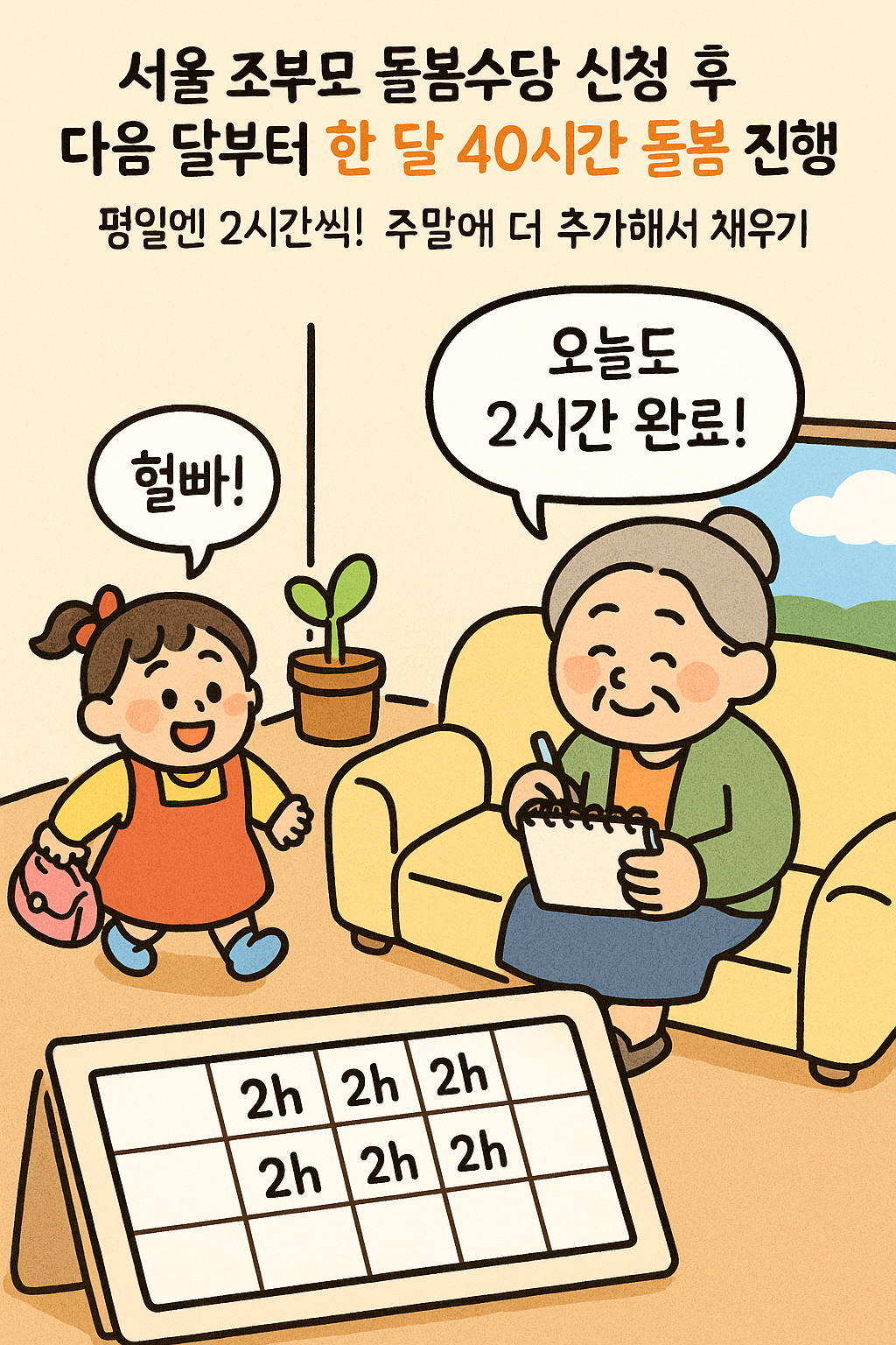서울 조부모 돌봄수당은 조부모·친인척이 담당하는 돌봄 시간에 대한 보상이기 때문에, 서로 성격이 달라요.