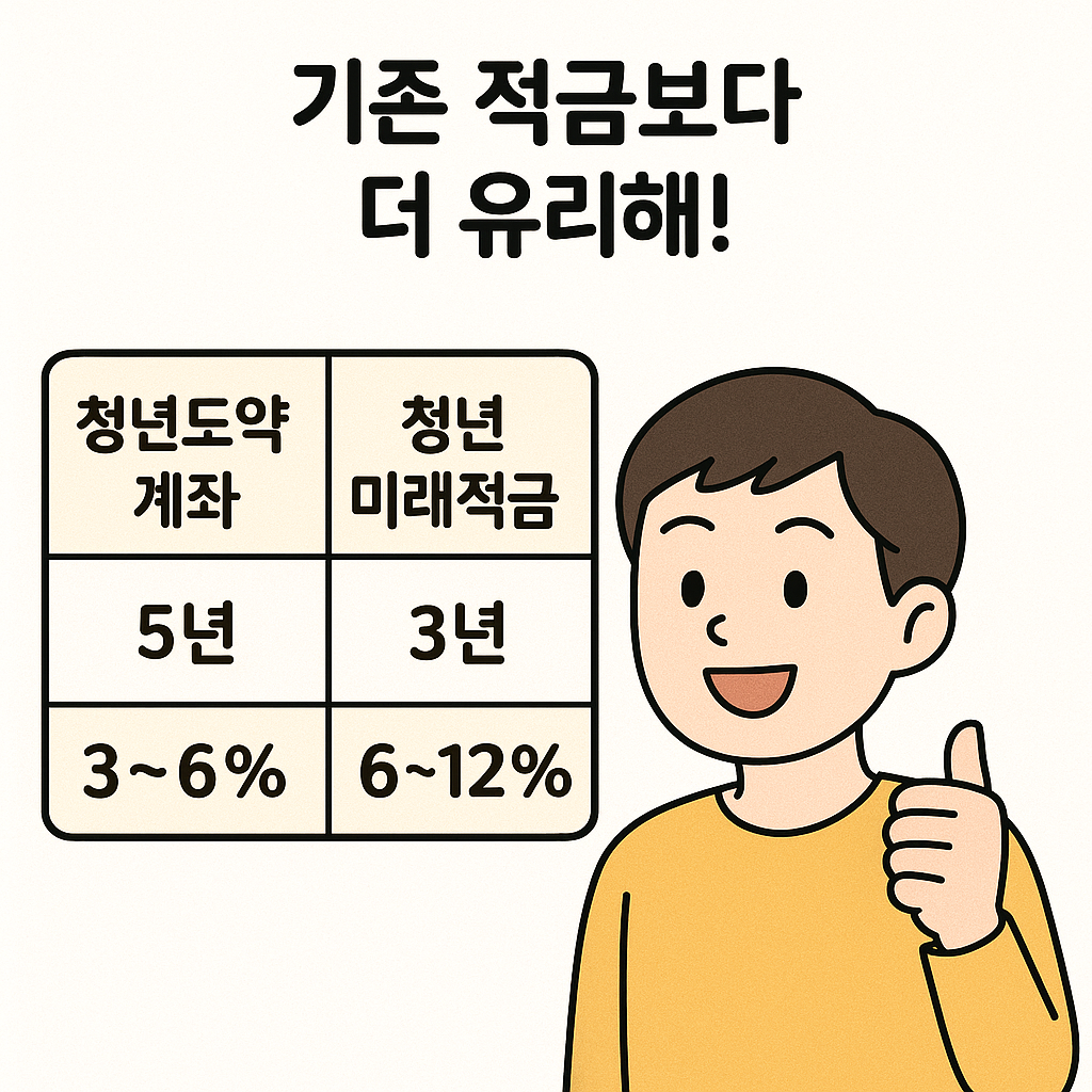 청년미래적금은 기간이 짧고 혜택 비율이 높아 현실적인 자산 형성에 더 적합하도록 설계된 구조입니다.